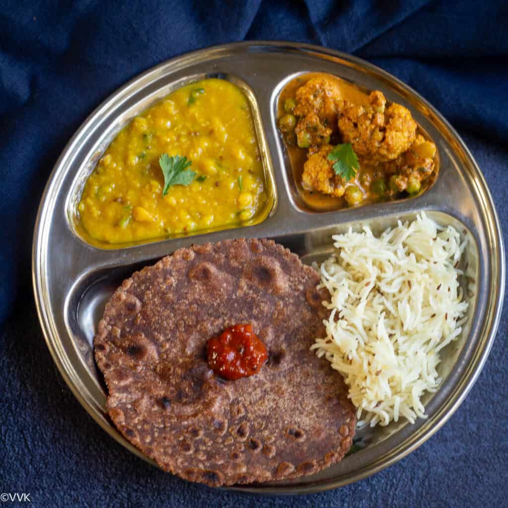 A mini thali with ragi roti and gobi matar: