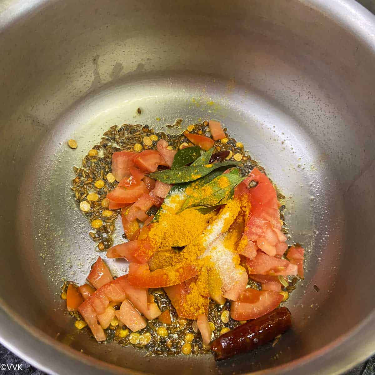 - Let the mustard seeds splutter, and then add the tomatoes, curry leaves, turmeric powder, and salt. Saute for two to three minutes or until the tomatoes are slightly soft.