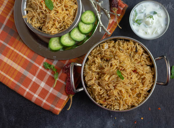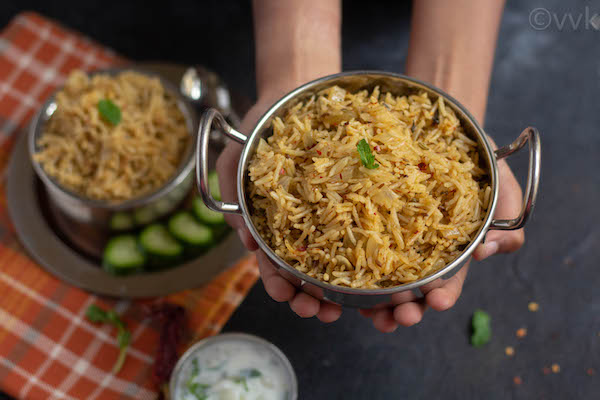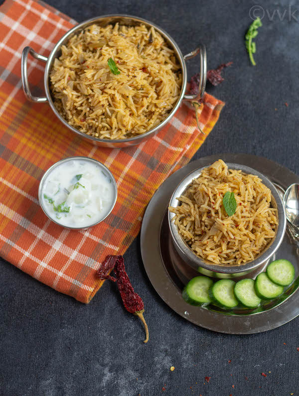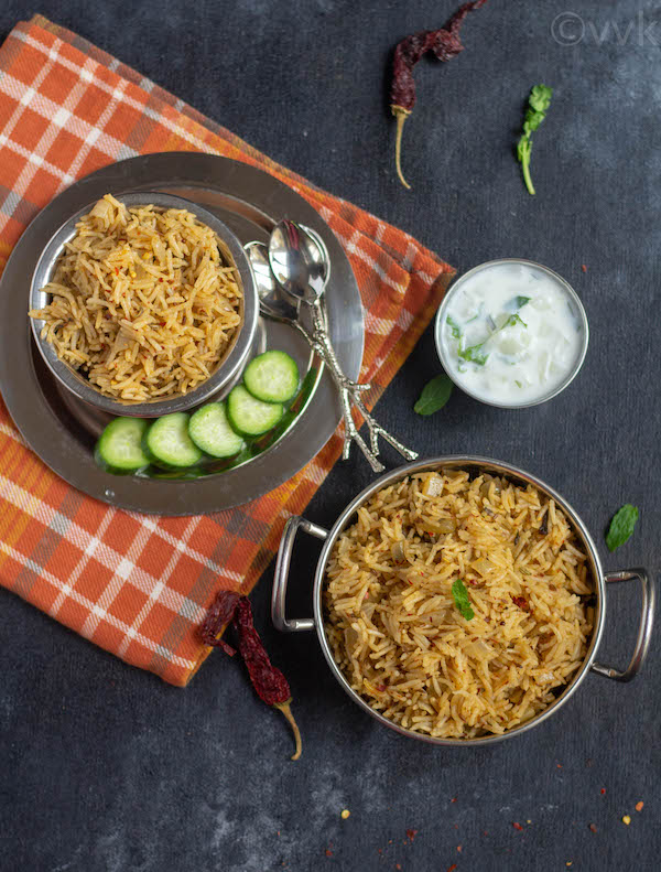 - Carefully open the lid after releasing the pressure and allow the pulav to cool for 5 minutes. Then fluff it up with a fork. Serve hot with raita.