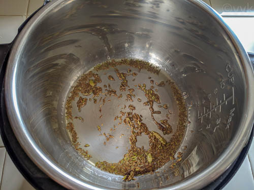 - After 30 seconds, add the cumin seeds, fennel seeds, cardamom, cloves, and cinnamon stick. Fry for 30 to 45 seconds.