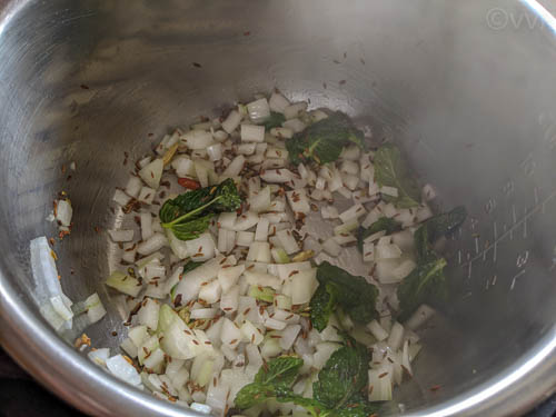 - Then add the chopped onion and mint leaves. Saute until the onion turns translucent.