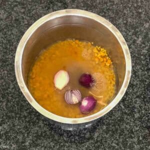 - Rinse the moong dal and chana dal thoroughly and add them to the cooking vessel. To this, add shallots, turmeric powder, and 1 cup of water.