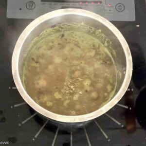 - Pressure cook for three whistles using a stovetop pressure cooker with the pot-in-pot method—add 2 cups of water to the base of the cooker, place the vessel inside, and cook. Let the pressure release naturally.