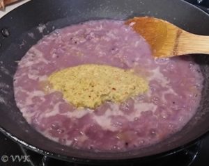 - Stir in the ground masala along with ¼ cup of water (used to rinse the mixer jar) and bring the mixture to a gentle boil. As cabbage releases more water, avoid adding extra liquid beyond the recommended amount.