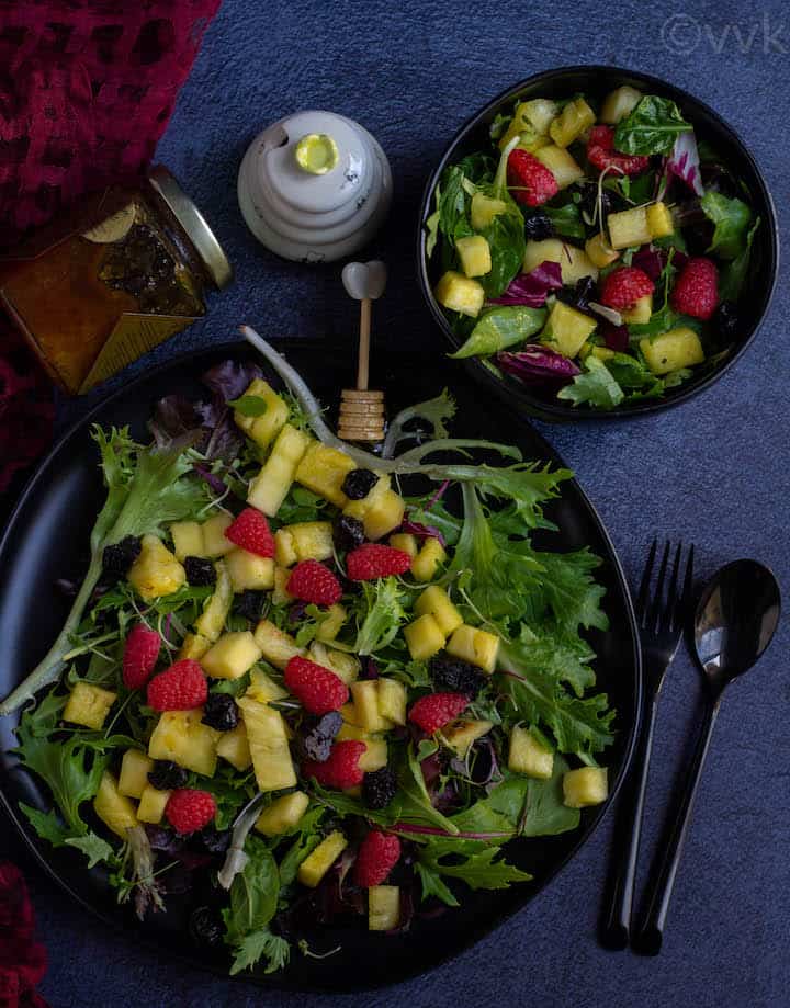 Today, I am going to share simple greens and fruit salad with honey. I did not any add any other sauces or condiments. This fruit salad with greens is a very basic recipe, and you can customize it according to your preference. Check the recipe notes section for the addons.