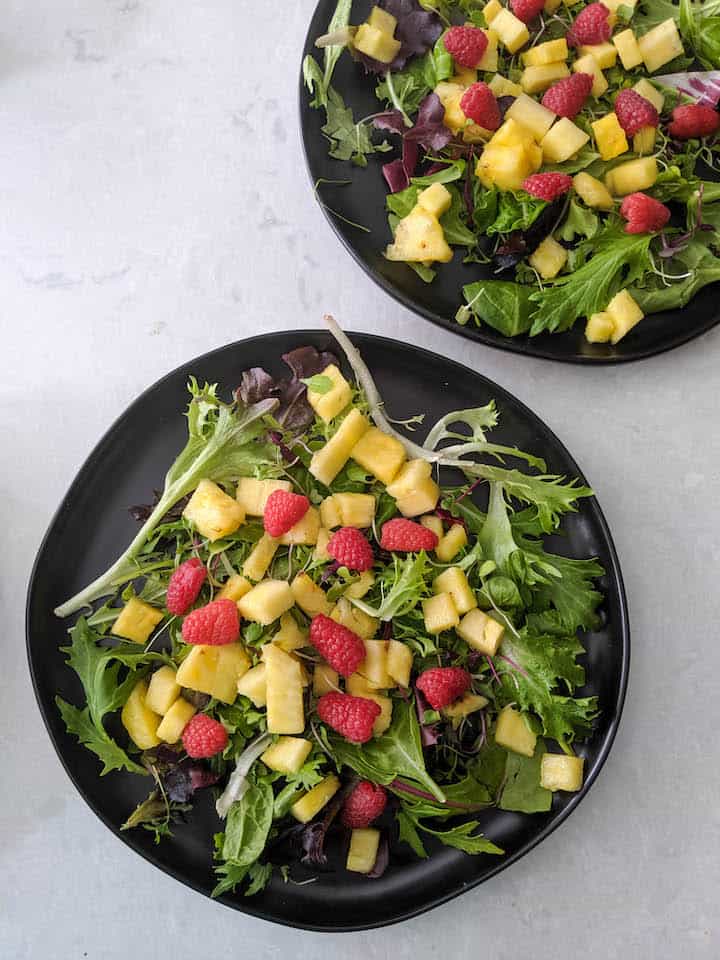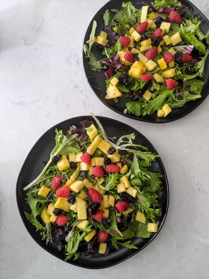 - I like this combo of pineapples and raspberries with greens. But you add other berries and available fresh fruits.