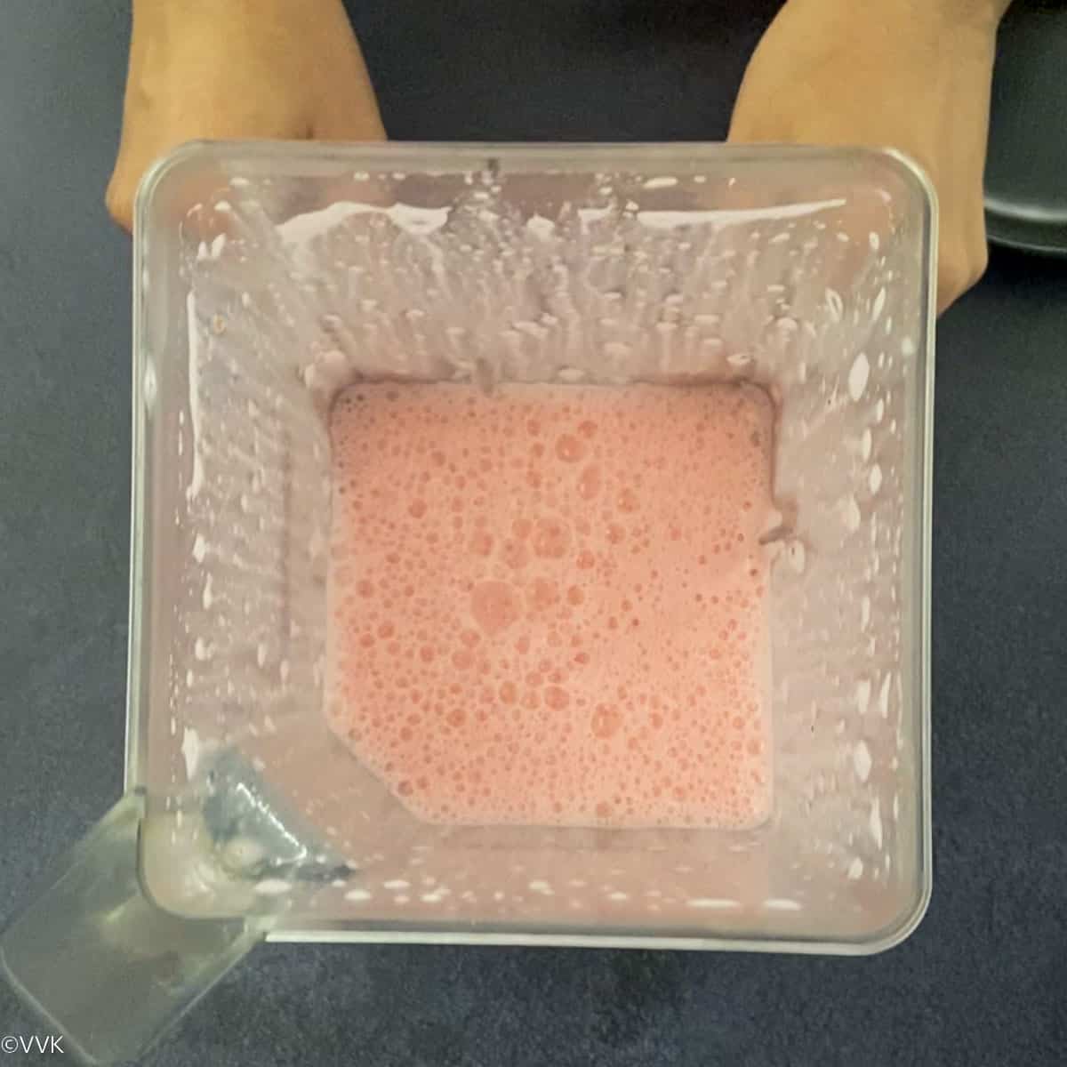 - Add the evaporated milk, gulkand, rose syrup, sugar, and pink food color to a blender or mixer jar and blend it thoroughly. This is to ensure gulkand mixes well in the milk.