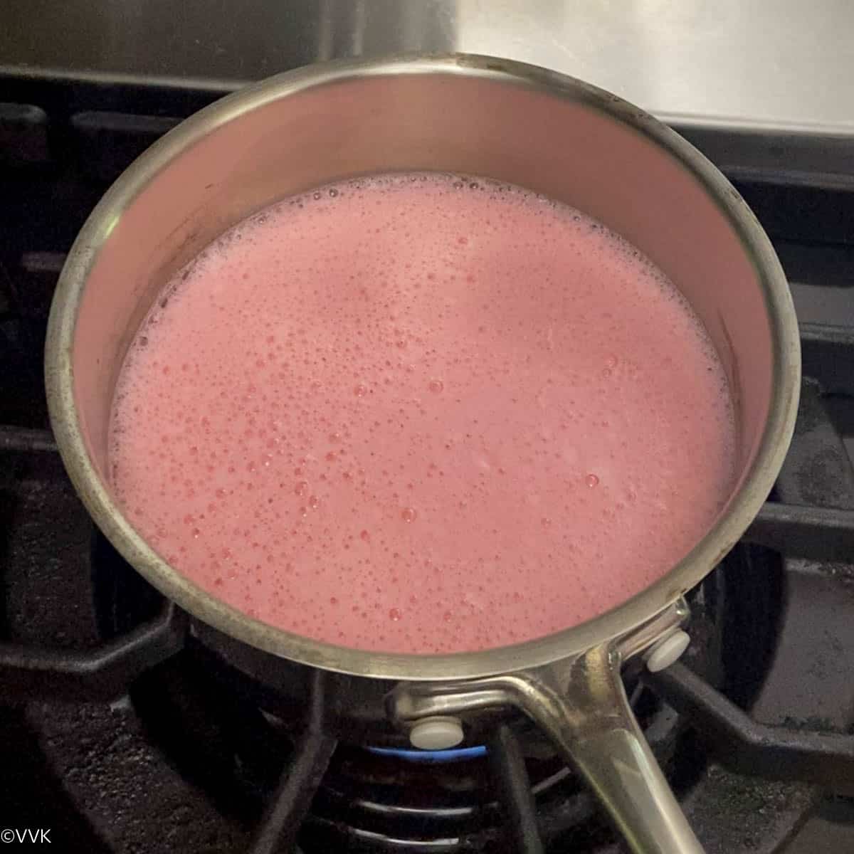 - Transfer the blended milk mixture to a saucepan and simmer it over medium-low heat.