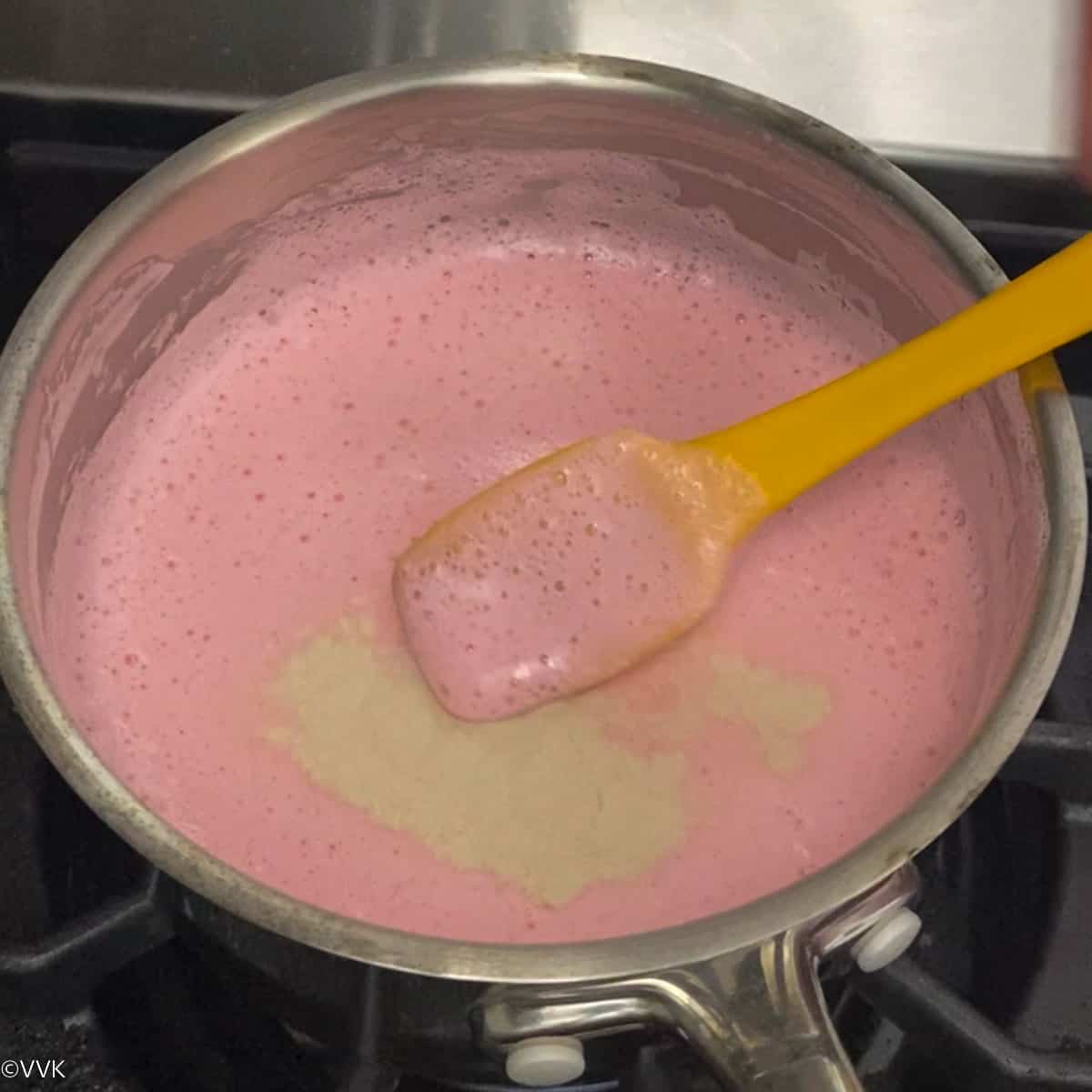 - When the milk mixture is warm (we don’t need to bring it to a boil), add the agar agar powder and mix well. Keep scraping the bottom as agar agar gets deposited in the bottom. Also, mix well to avoid agar becoming clumpy. After adding agar, reduce the heat to low, and gently simmer the milk for 4 to 5 minutes.