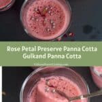 Gulkand panna cotta, a rich and creamy panna cotta with refreshing flavors of rose syrup and gulkand/rose petal preserves set using agar agar. Easy to make and a crowd-pleaser recipe perfect for this festive season.
