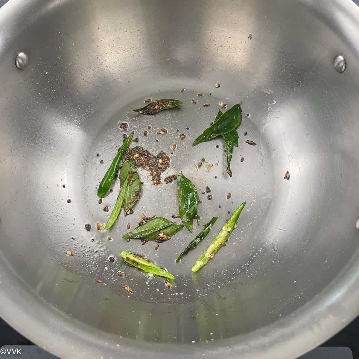 - Heat the same pan and add the oil. When the oil is hot, add the mustard seeds, cumin seeds. Let the mustard seeds sizzle and add the asafoetida, curry leaves and slit green chili. Saute until the green chilies are slightly blistered.