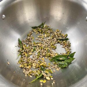 - Reduce the heat to medium-low, add the pumpkin seeds and sunflower seeds, and roast for a couple of minutes.