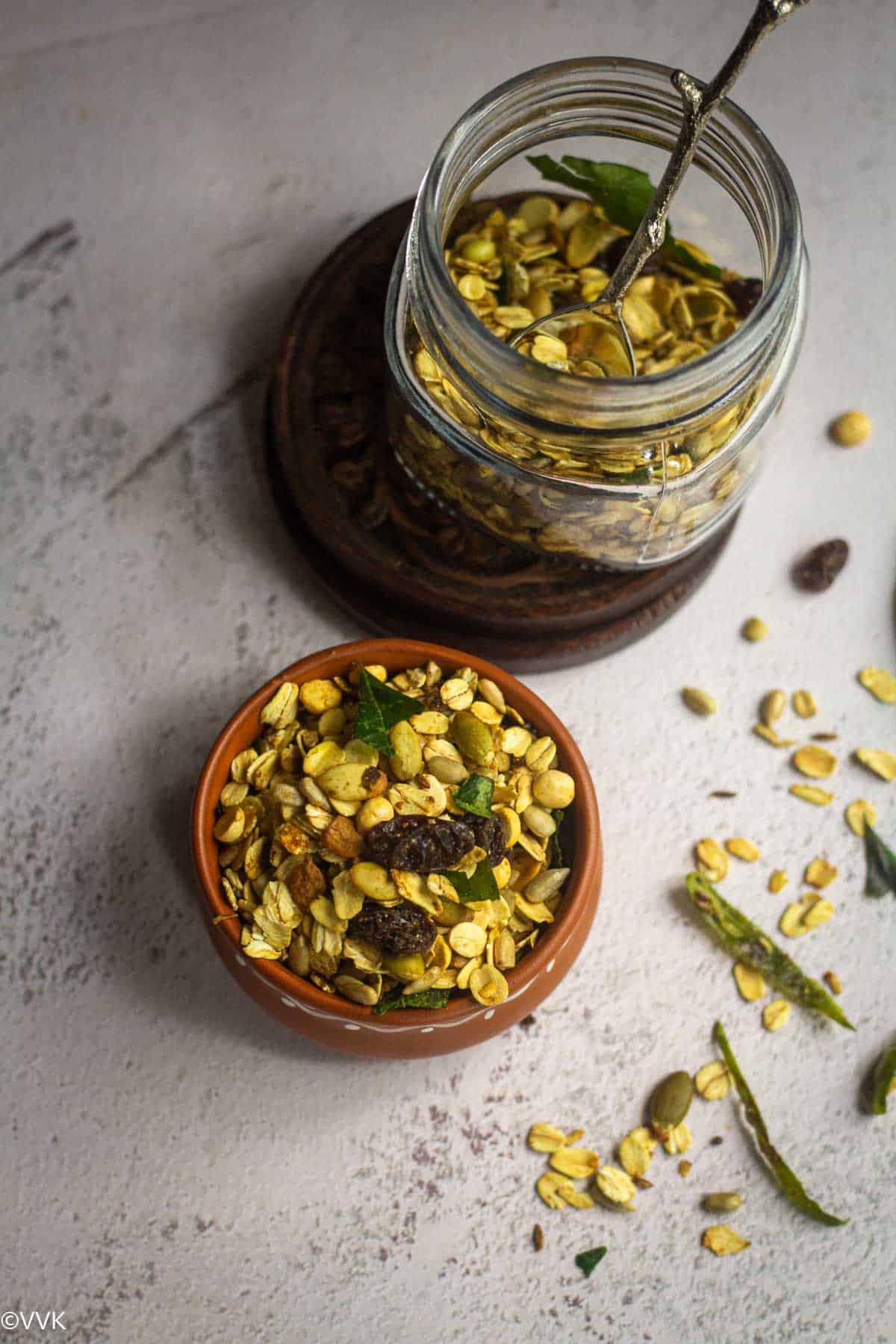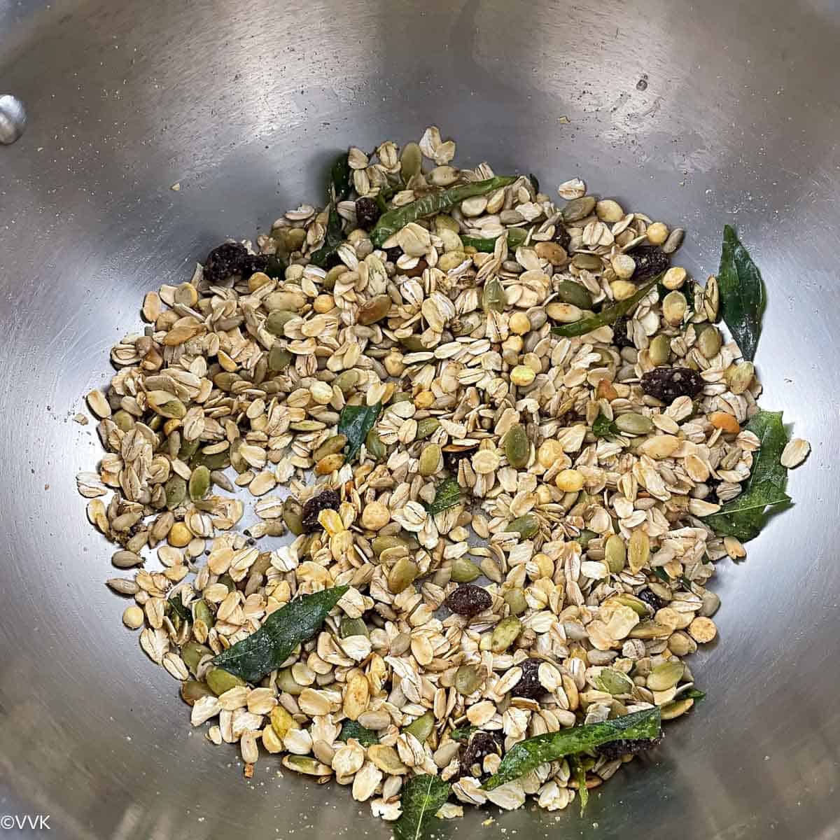- I kept it nut-free but feel free to add peanuts and roast them before adding the oats. You can also include poha and dry coconut.