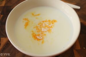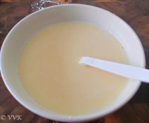- To this ¼ cup of lukewarm milk, add the 3 tbsp of custard powder.