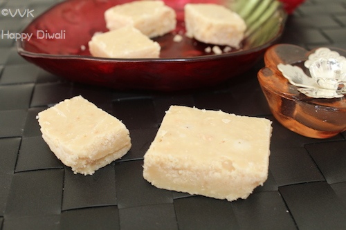 I won’t say that this is the perfect kaaju Katli. It tasted really well and the texture was good too but the shape I couldn’t get it. Friends came over the weekend and this sweet was all gone within no minute. Thankfully I clicked the pictures before. I am yet to analyze my mistake. Probably I thought I am making mysore paahu back in my mind and went with these shapes. As the Kaju Katli was soft, tasted well I couldn’t add it to the disaster list. So posting it here but there is a lot of room for improvement and hopefully next year I can prepare perfect shaped ones.