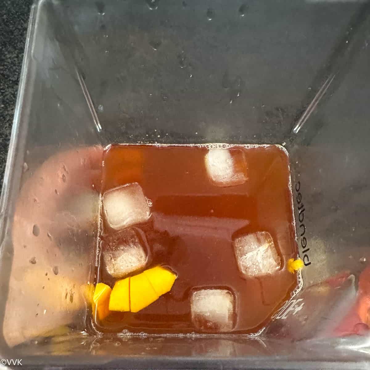 - Add the brewed tea, lemon/lime juice, fresh mango pulp, and ice cubes into the blender.