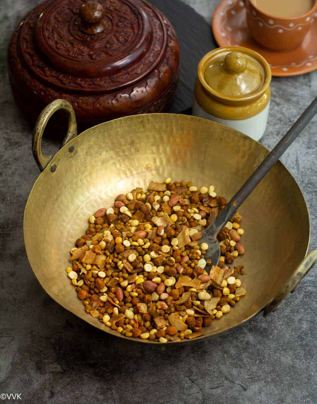 - Turn off the heat and add the roasted coconut, peanuts, and roasted gram. Mix well and let it cool. Store in an air-tight container.