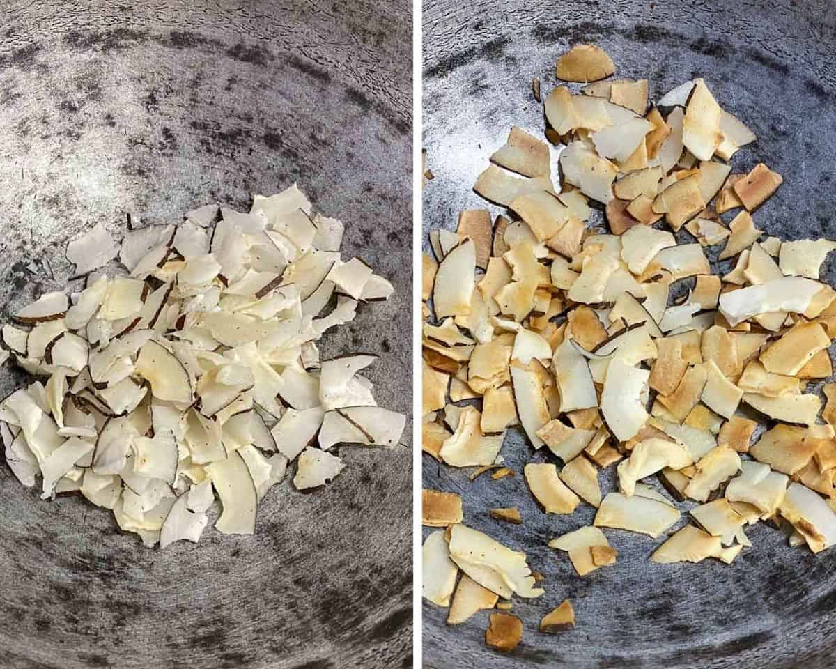 - Heat a heavy-bottomed kadai or pan and start roasting the ingredients one by one without any oil. I first started with dry coconut pieces. Roast the coconut pieces until they turn lightly golden brown and crisp over medium-low heat. It usually takes about 5 to 7 minutes. Remove the roasted coconut and set it aside on a plate or bowl.