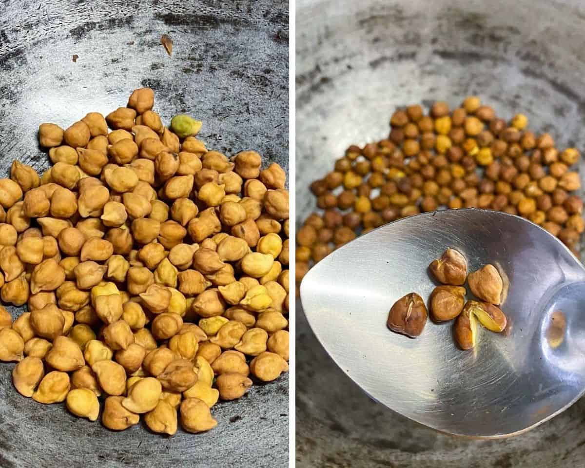 - Next, add the black chickpeas to the same pan. Roast the chickpeas until they are dry and crisp. It will start to pop and split like below. It took me 25 minutes to roast the chickpeas. I would recommend tasting the chickpeas. If it has reached the desired crisp texture, stop roasting. Now remove the roasted chickpeas and set them aside in a bowl. (do not mix it now with roasted coconut)