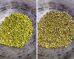- Next, add the green mung beans to the same pan. Like chickpeas, roast the green mung beans until they are dry and crisp. It took me 15 minutes to roast the green mung beans. Taste the beans and if it has reached the desired crip texture, stop roasting. Remove the roasted mung beans and set them aside in the same bowl as black chickpeas. You can mix the green mung beans and chickpeas.