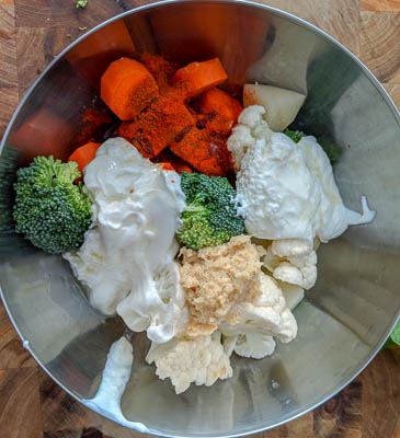 - In a mixing bowl, add all the vegetables, yogurt, ginger-garlic paste, red chili powder, oil, lemon juice, and kewra water.