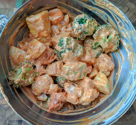 - Mix thoroughly and ensure the spices are well coated.