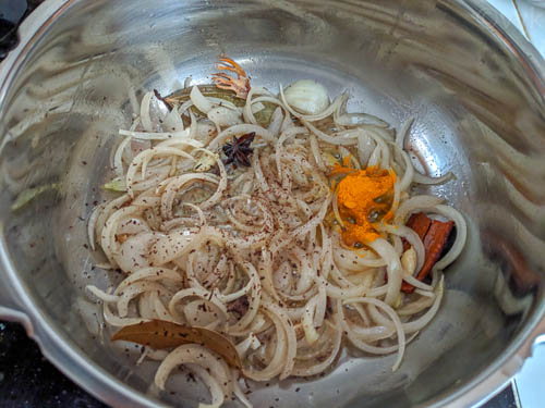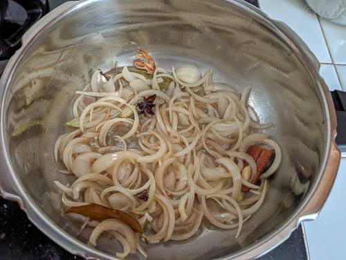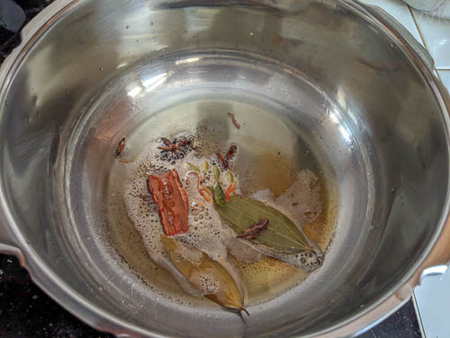 - In a pressure cooker, add the oil and ghee. When the oil is hot, add the bay leaf, cinnamon, cardamon both green and black, star anise, cloves, and mace. Fry for 30 seconds.