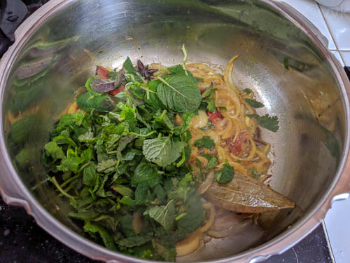 - Then add the mint and cilantro leaves and cook until they wilt.