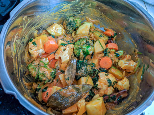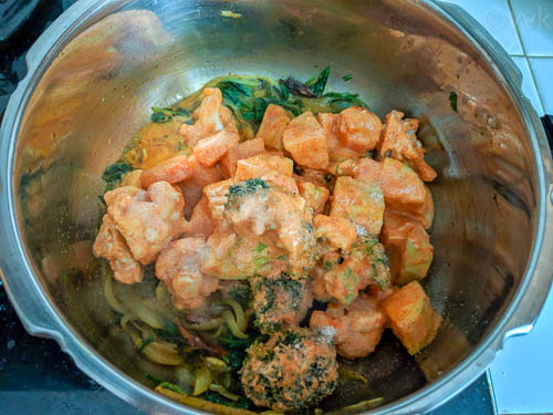 - Next, add the marinated veggies and mix thoroughly.