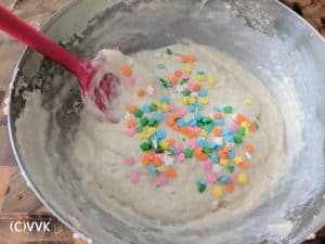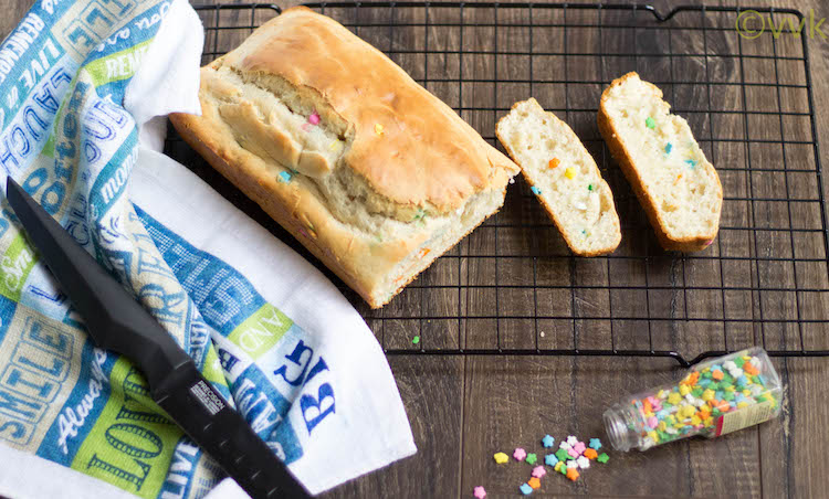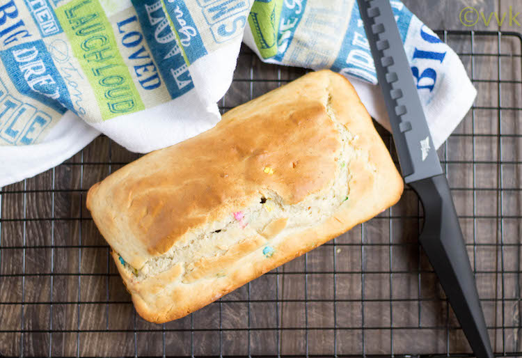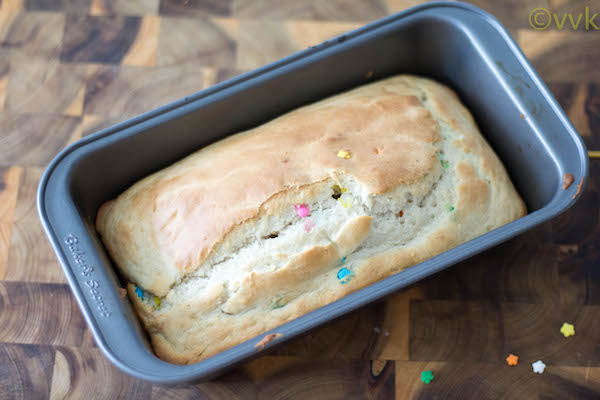 The first recipe that I tried for this marathon is also this recipe. I might have baked this more than five times by now with all different ice cream flavors, with and without tutti frutti and with and without confetti. This bread reminded me of the wonder cake that we used to have in India. For this recipe, I used vanilla flavored ice cream and some colored confetti/sprinkles. But that’s entirely optional.