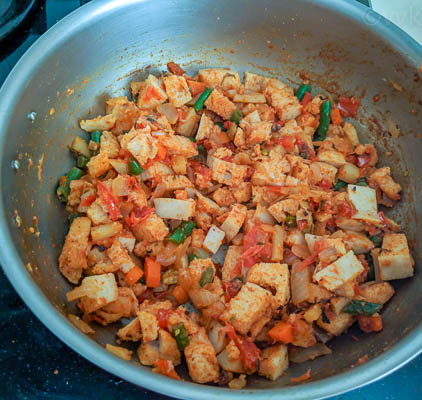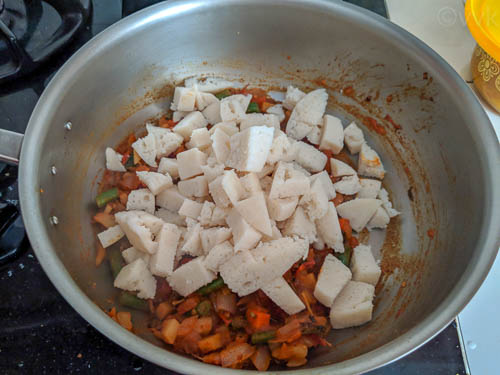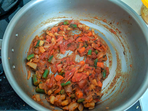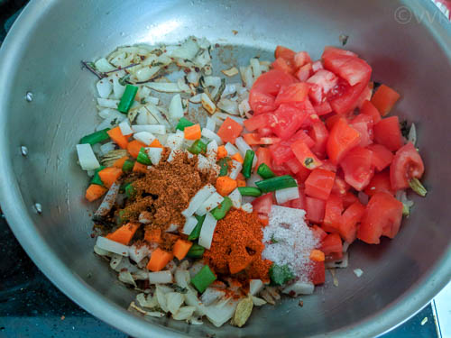 - Next add the mixed vegetables, tomatoes, red chili powder, garam masala, and salt.