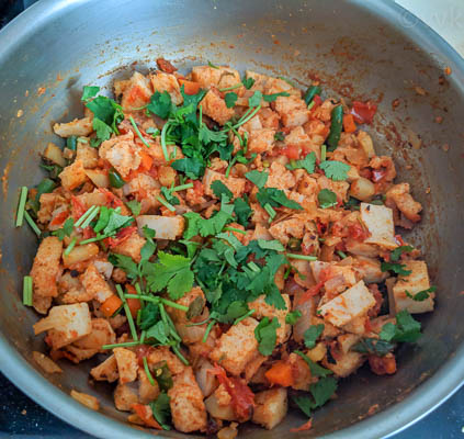 - Cook for two to three minutes and turn off the heat. Garnish it with chopped cilantro and serve hot with raita.