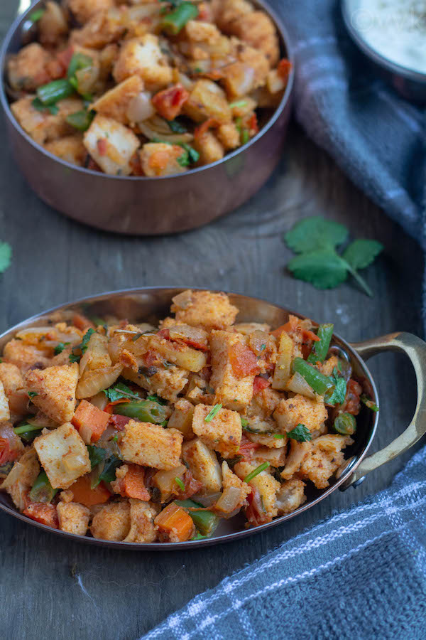 I had Iranian biryani on my list, but on a whim, I prepared this idli biryani one day with leftover idlis and carrots. We all liked it. So made it again with mixed vegetables and now here I am sharing the same with you all. Leftover idlis work best for this recipe. But if you are using fresh idlis, make sure the idlis are cool. Hot/warm idlis will lose the shape as you mix them.