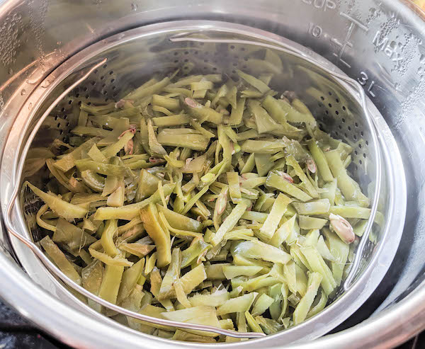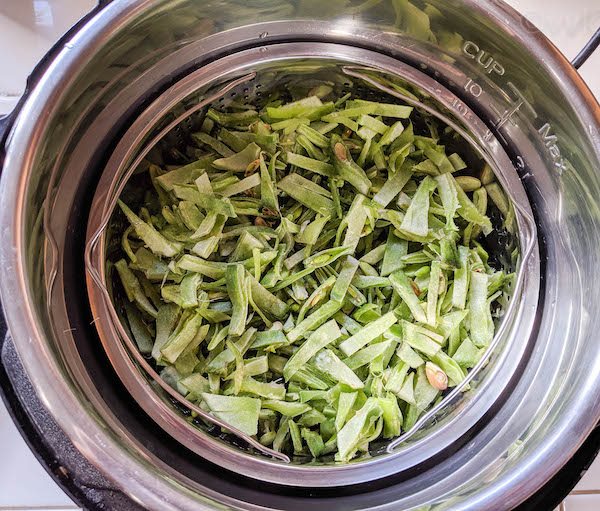 I highly recommend the steamer rack or the steaming basket accessory for the Instant Pot. It comes in handy for steaming all the vegetables. Place the chopped broad beans in the steamer basket.
