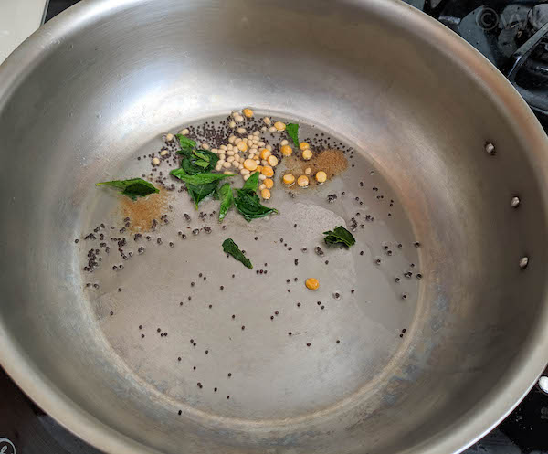 - Heat a pan and add oil. When the oil is hot, add the mustard seeds, urad dal, chana dal, and hing.
