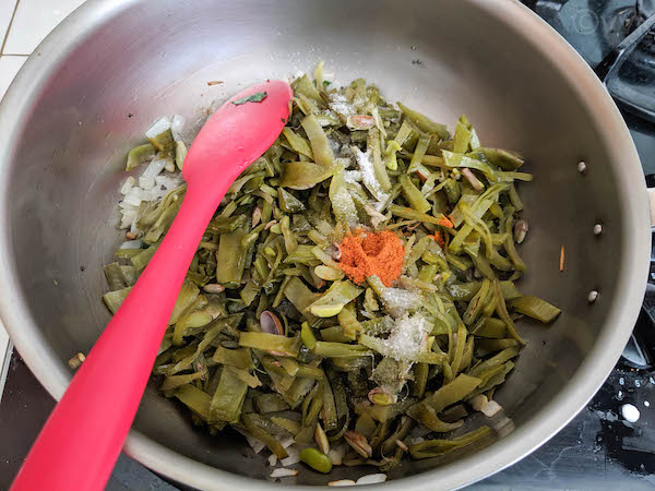 - Then add the beans, salt, and red chili powder. Mix well, and you may notice salt oozing out some water. It is normal. Cook until all the moisture is absorbed for about 4 to 5 minutes over medium heat.