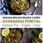 Indian broad beans curry or avarakkai poriyal, as we say in Tamil, is a simple stir-fry with peanuts but without coconut. This avaraikai poriyal with peanuts pairs well with both rice and roti. Check out how to steam Indian broad beans in Instant Pot and to make this delicious curry.