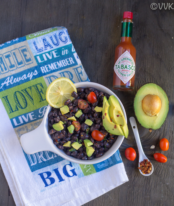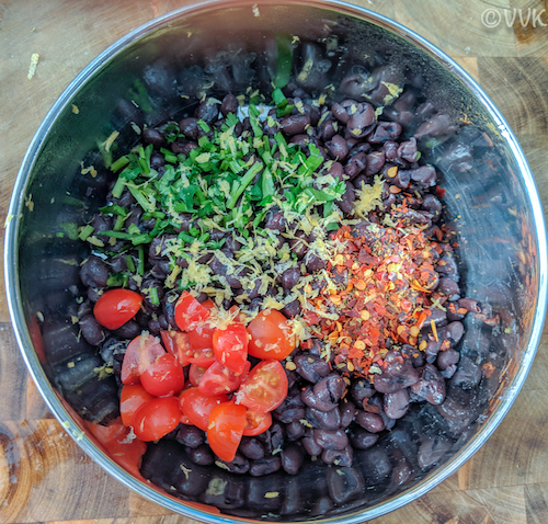 Guess what; I made this as no onion no garlic salad so that I can have it on Thursdays as well. But feel free to add garlic powder to the dressing and also the onions. It’s a very simple salad. All you have to do is mix some black beans, olive oil, hot taco seasoning, Tabasco sauce, cherry tomatoes, cilantro, lemon juice, salt, and lemon zest. Just adjust the amount of taco seasoning and Tabasco as per your preference.