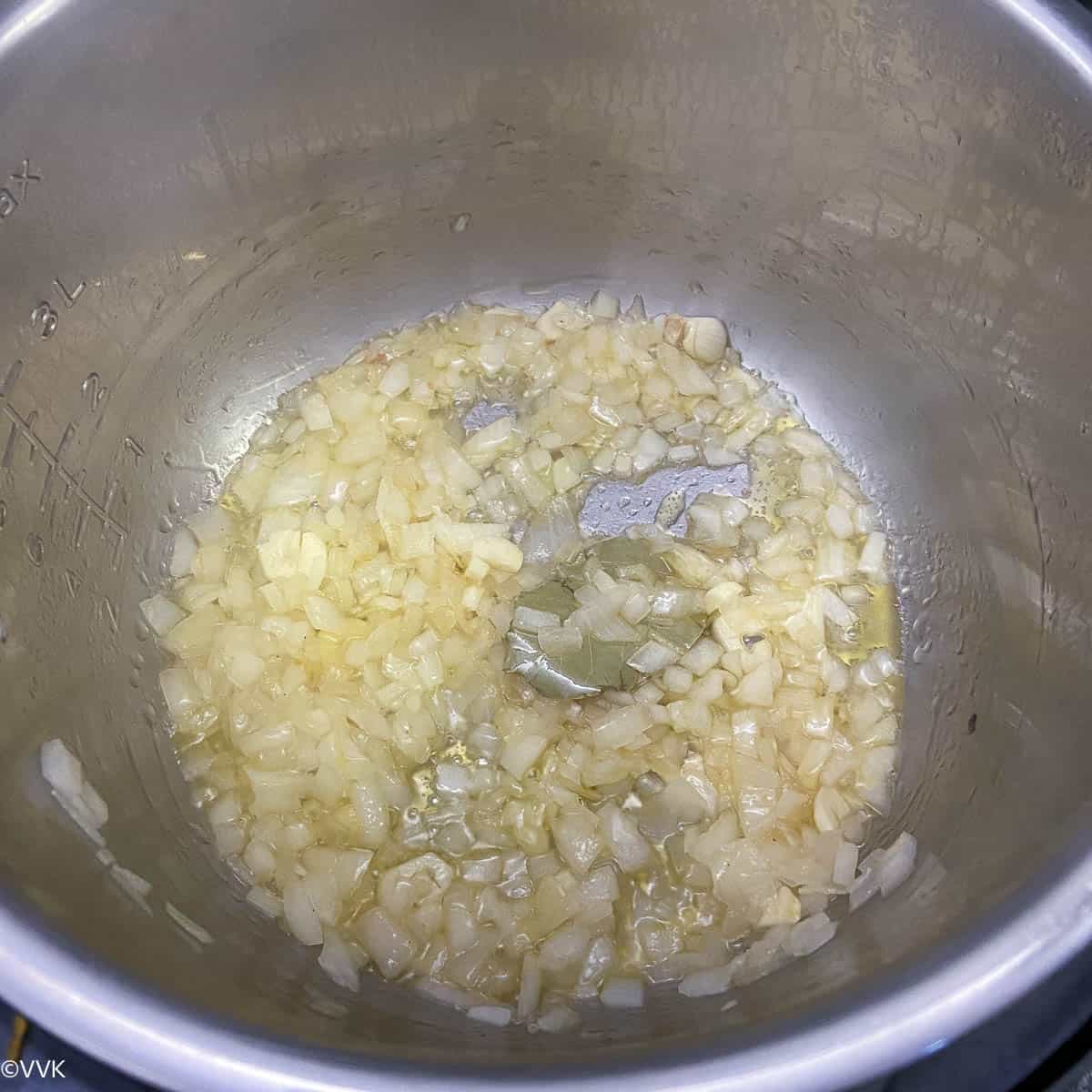 - Set the Instant Pot in saute mode. Add the 3 tbsp of oil and, when the oil is hot, add the bay leaf chopped onion and garlic. Add the salt and sugar as well. Water will ooze out, and it’s normal. Saute until the onion turns soft and tender or for about 3 to 4 minutes. Now turn off the Instant Pot. Turning it off after sauteing onion helps to prevent the burn signal in the newer Instant Pot models.