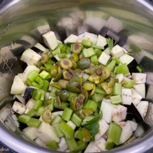 Olives, capers, and raisins: Apart from the vegetables, we also add green olives, capers, and raisins. It’s a sweet and sour vegetable dish, and the flavors are bold. Try not to skip these ingredients, and these are readily available in the groceries.