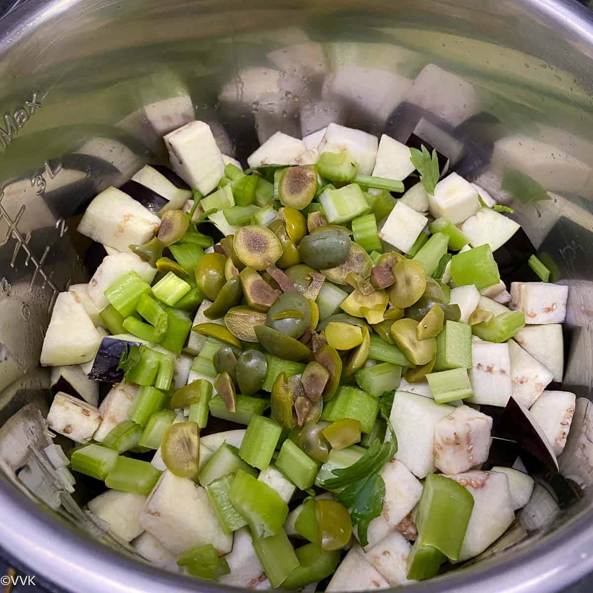 - As we are making it in Instant Pot, it’s won’t be thick like a relish. Eggplant oozes out water when we pressure cook, so it’s more like a stew. When serving on top of bread, drain the liquid and serve.