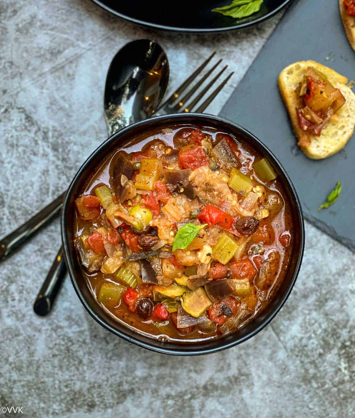 I know this caponata is a medley of summer vegetables, but you can find eggplant all around the year in the groceries so that you can try it out irrespective of the season. The ingredient list might sound lengthy, but trust me, it’s an easy recipe. It’s a saute, dump-and-go kind of recipe. Once the chopping is complete, you can make it in less than 30 minutes.
