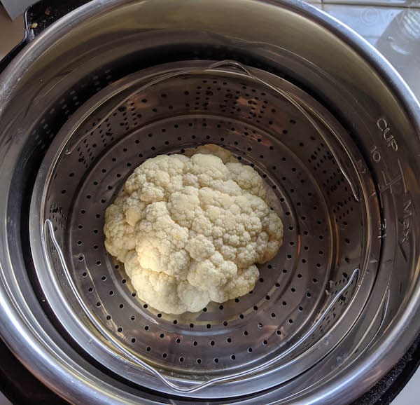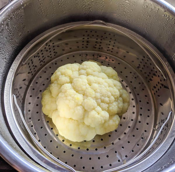 - Now place the cauliflower in the steamer basket. Add 1 cup of water to the inner pot and place the trivet. Then keep the steamer basket with the cauliflower on the trivet and close the lid. Make sure the vent is in the sealing position.