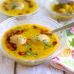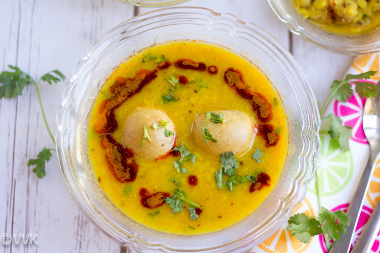 There are multiple ways to serve the bafla, but this is how I served. Usually, they don’t add the bafla directly to the dal, but I just added two like how we do for the south Indian lentil sambar / paruppu Kuzhambu.