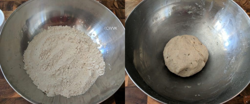 - Now add water little by little and mix the ingredients to form a nice dough. I used about ½ cups + 1 tbsp of water.