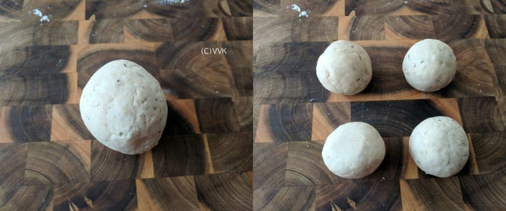 - Divide the dough into equal sized balls. I just divided them into four medium-sized balls like below. Roll them in your palms and make it smoother.