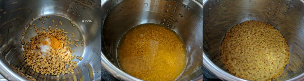 - Add the washed toor dal, salt, turmeric powder and 1.5 cups of water in a pressure pan or cooker and cook for up to 3 to 4 whistles.