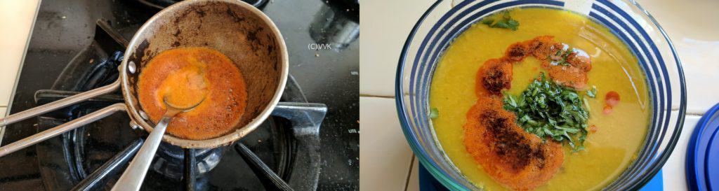 - In a separate tempering pan, heat the ghee. Once the ghee is hot, reduce the heat and add mustard seeds, cumin seeds, hing and red chili powder. Make sure you cook this over a low flame to prevent the red chili powder from burning.