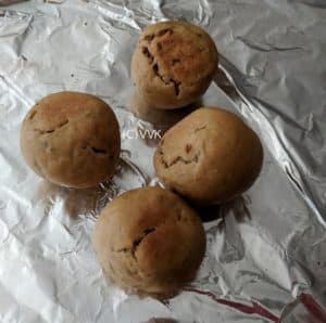 - Place the bafla in the baking tray and bake for about 30 to 35 minutes until they are crisp and firm like below. Make sure you turn once in between. I baked for 32 minutes. While the baking is happening, you can prepare the dal.