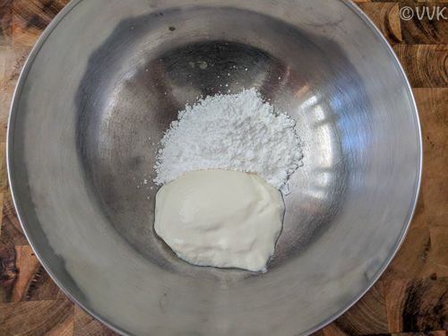 - Add the yogurt and sugar in a bowl and whisk them together. Make sure the sugar all dissolved.